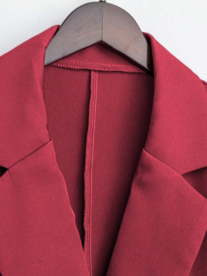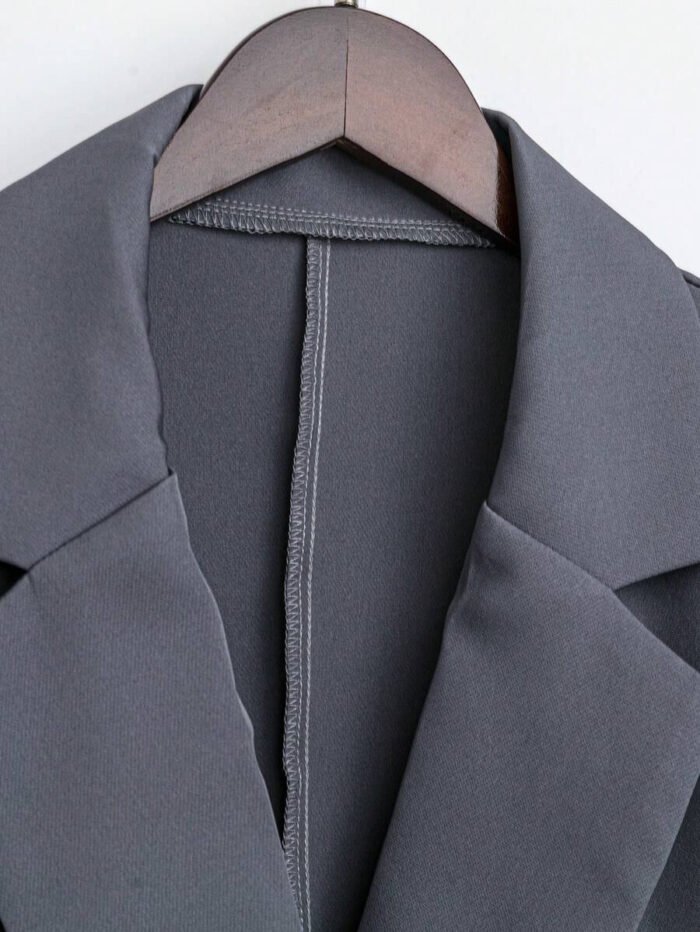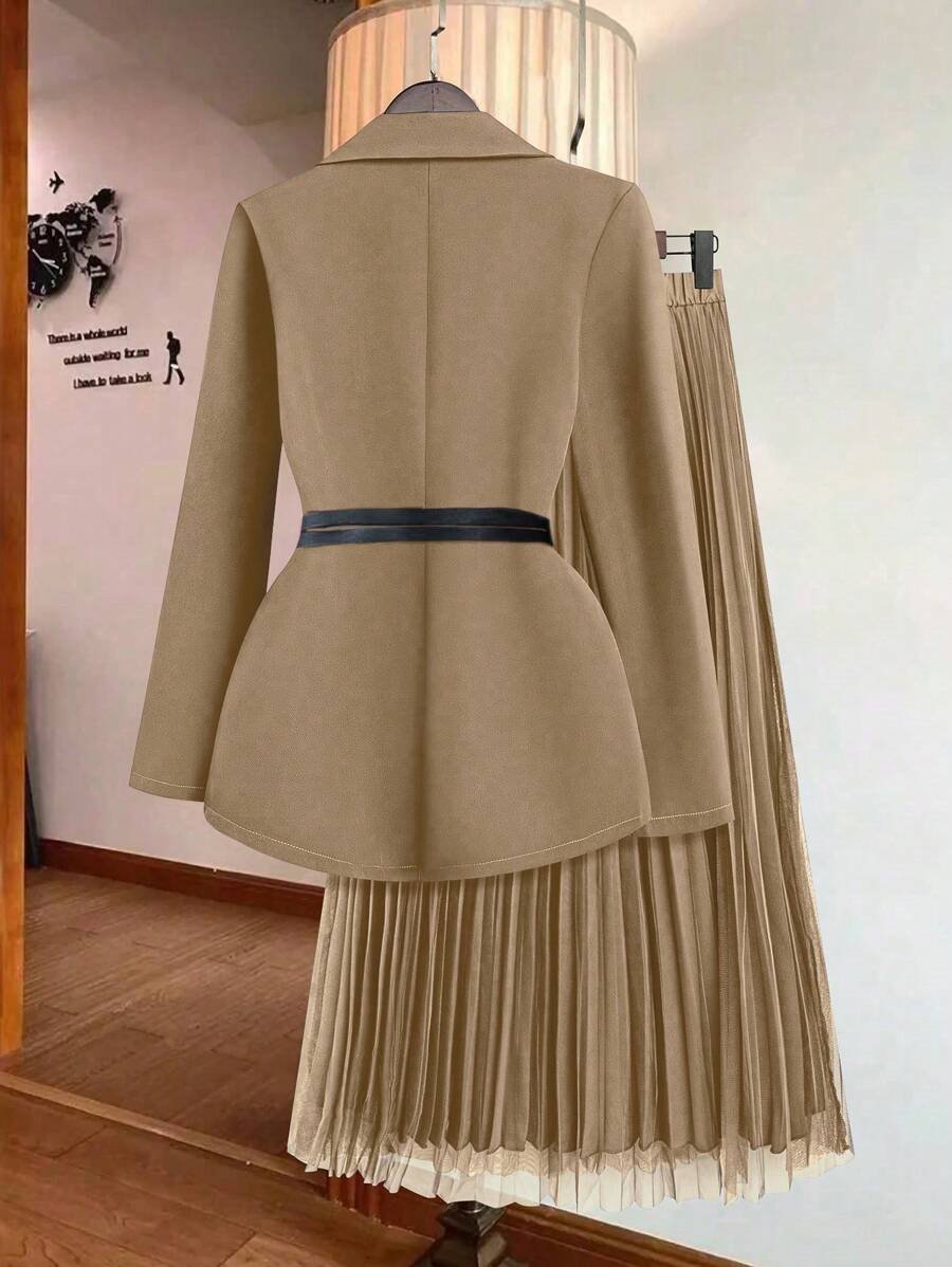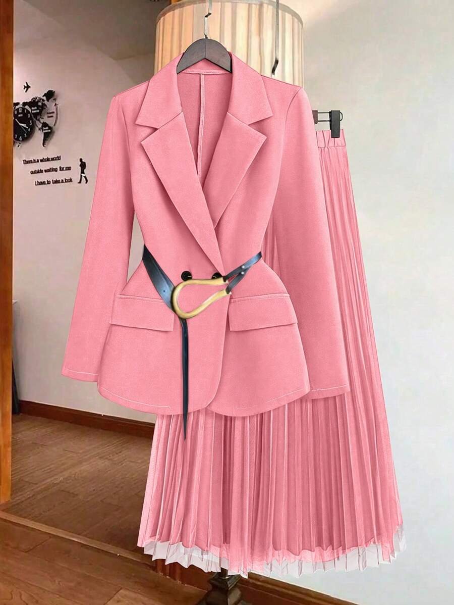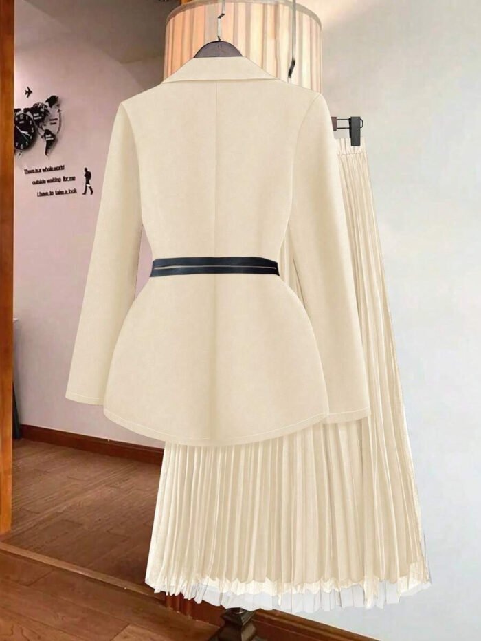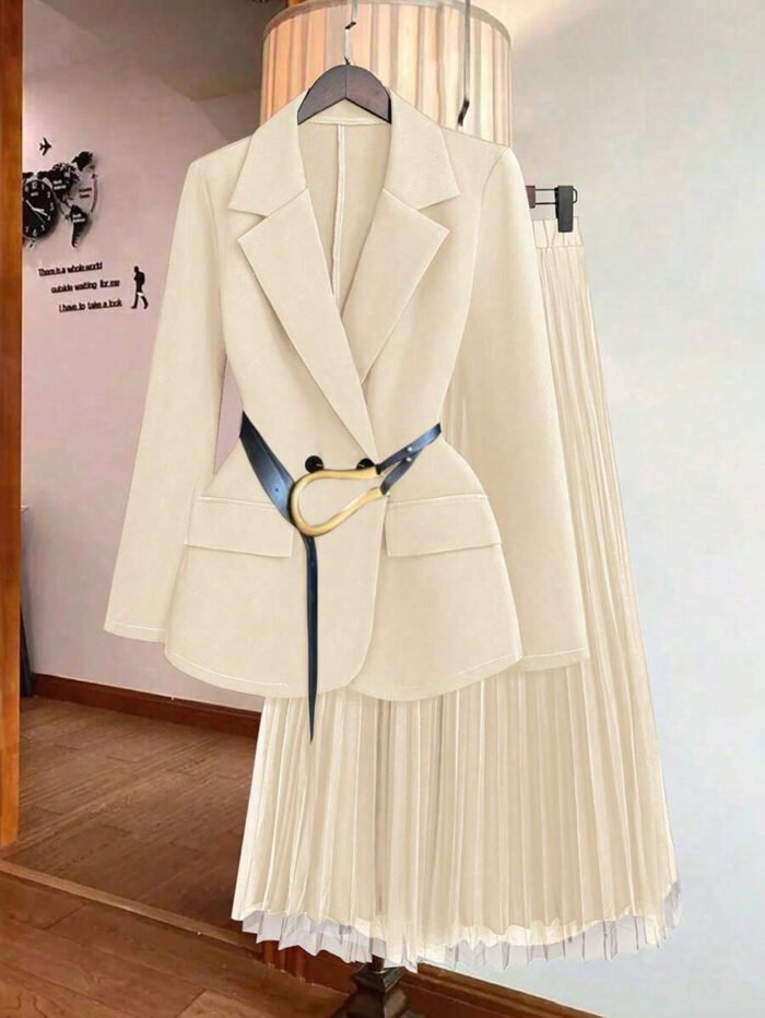 - الحزام يبرز الخصر ويمنح توازنًا رائعًا بين البليزر والتنورة.