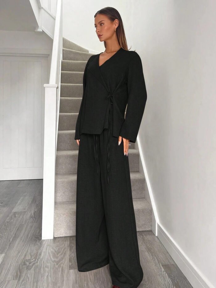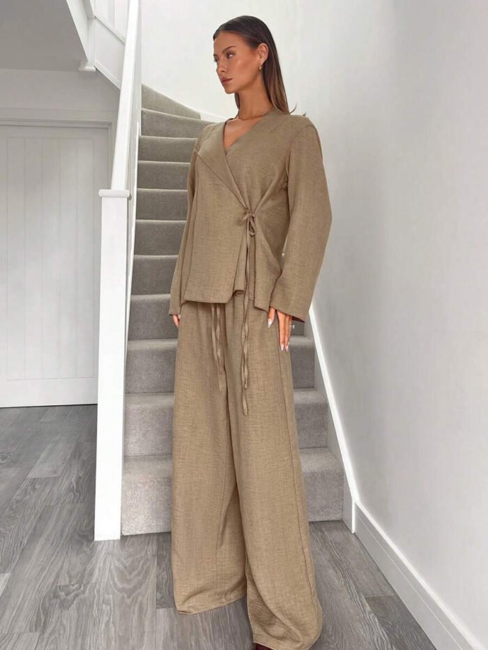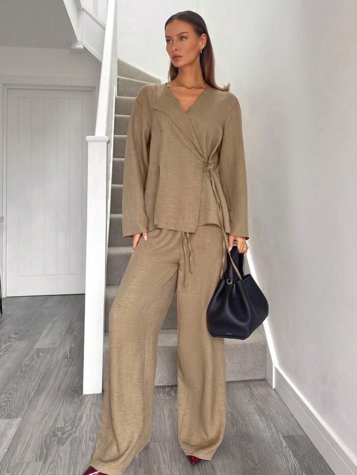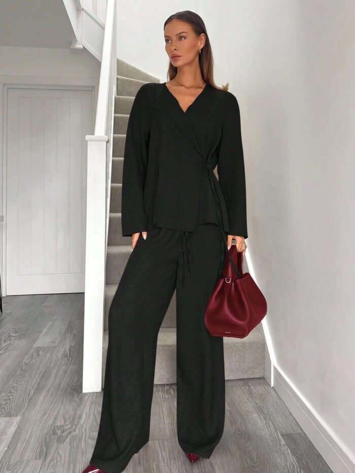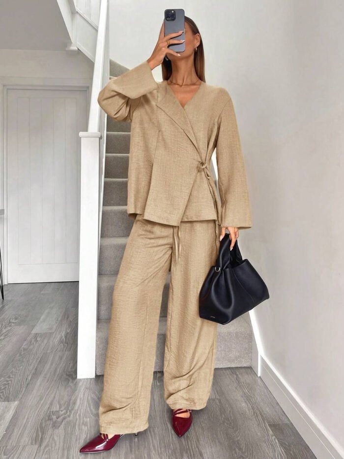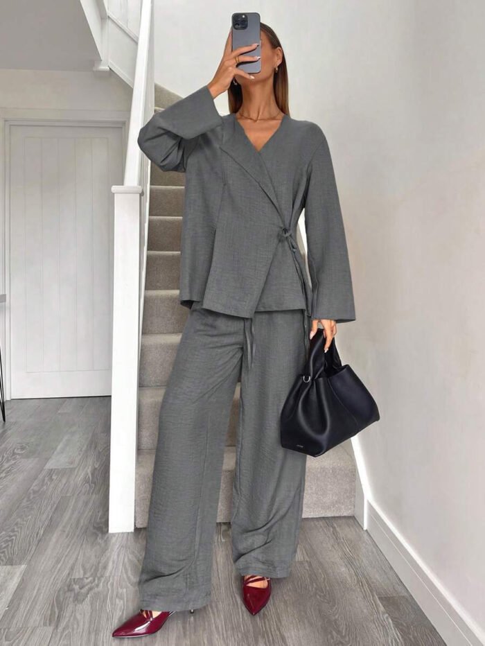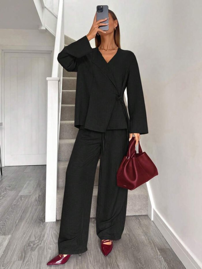 يتكون طقم بدلة نسائية من بلوزة أنيقة ذات ياقة على شكل حرف V، تُبرز جمال رقبتك وتضيف لمسة أنوثة جذابة. يمكنكِ تعديل الرباط الأمامي ليناسب مقاسك تمامًا ويمنحكِ إطلالة فريدة ومُخصصة. أما البنطلون الواسع، فهو مصمم ليوفر لكِ الراحة وحرية الحركة طوال اليوم، مما يخلق توازنًا مثاليًا بين الأناقة والعملية.