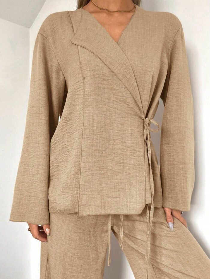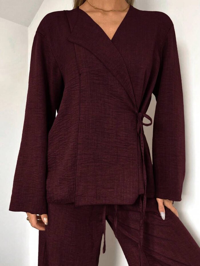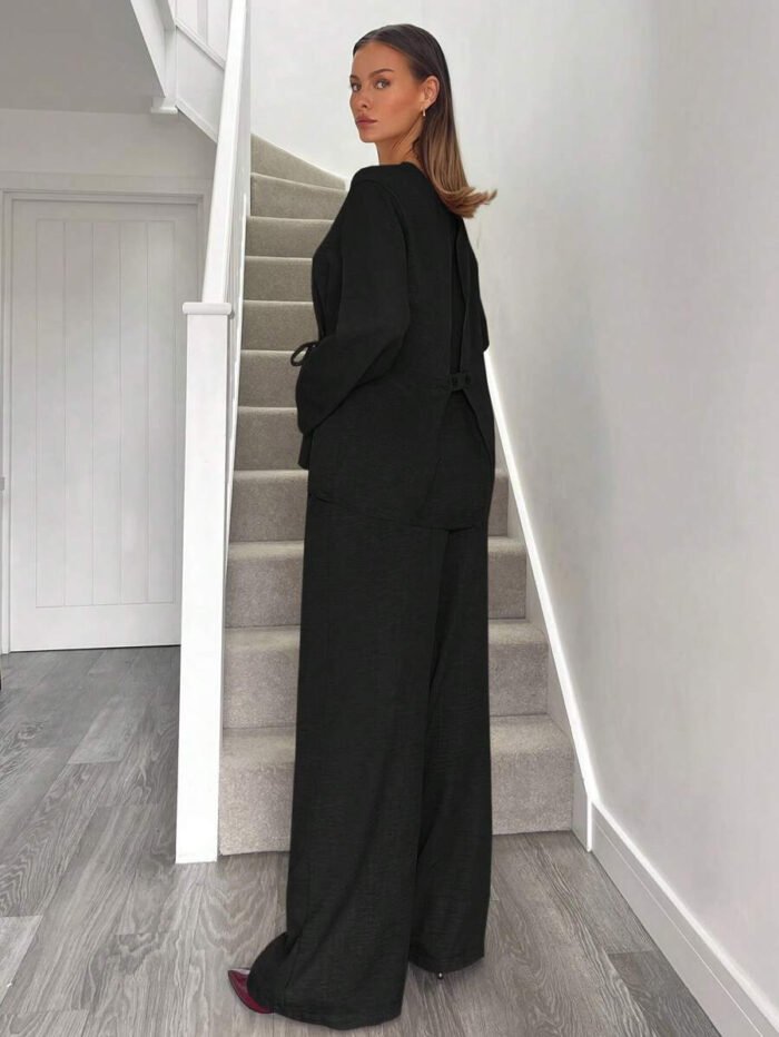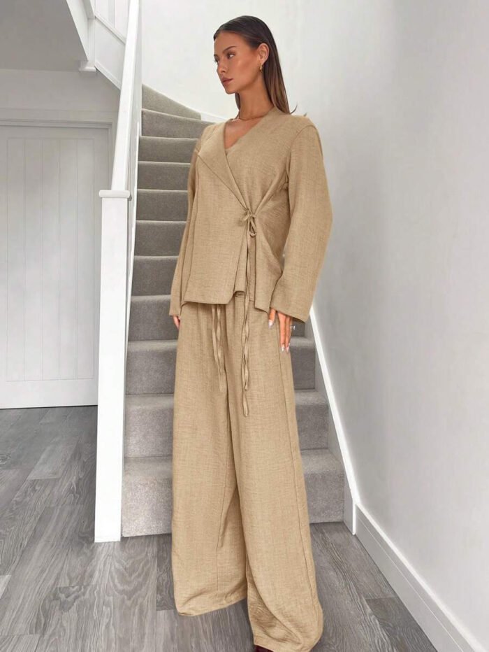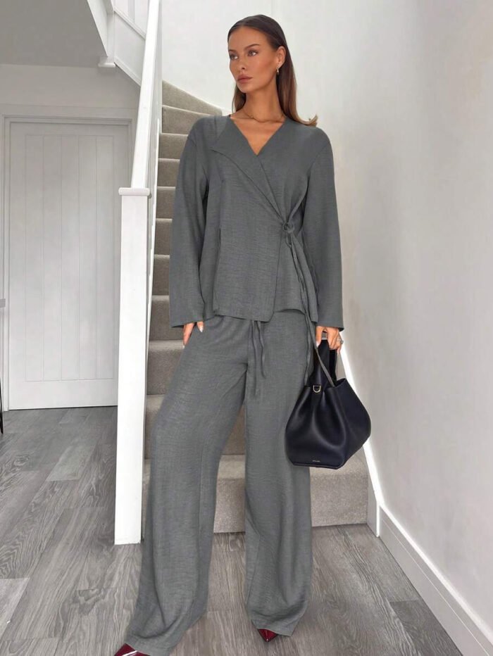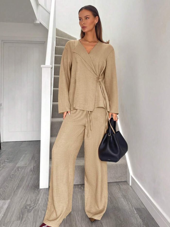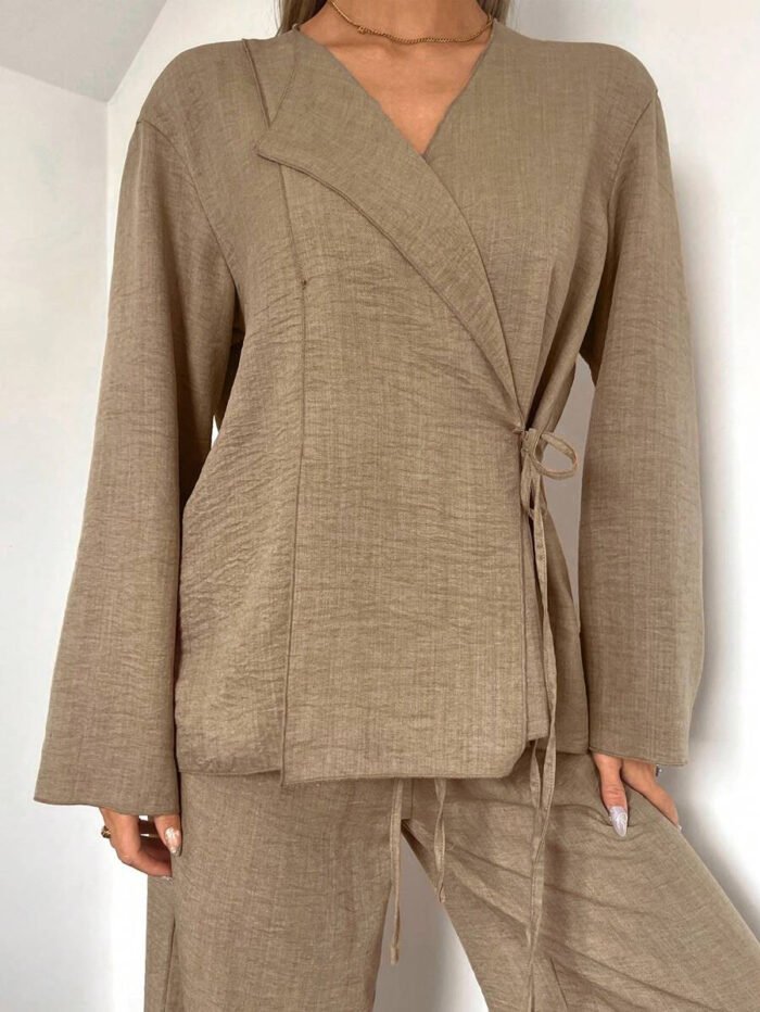 يتكون طقم بدلة نسائية من بلوزة أنيقة ذات ياقة على شكل حرف V، تُبرز جمال رقبتك وتضيف لمسة أنوثة جذابة. يمكنكِ تعديل الرباط الأمامي ليناسب مقاسك تمامًا ويمنحكِ إطلالة فريدة ومُخصصة. أما البنطلون الواسع، فهو مصمم ليوفر لكِ الراحة وحرية الحركة طوال اليوم، مما يخلق توازنًا مثاليًا بين الأناقة والعملية.