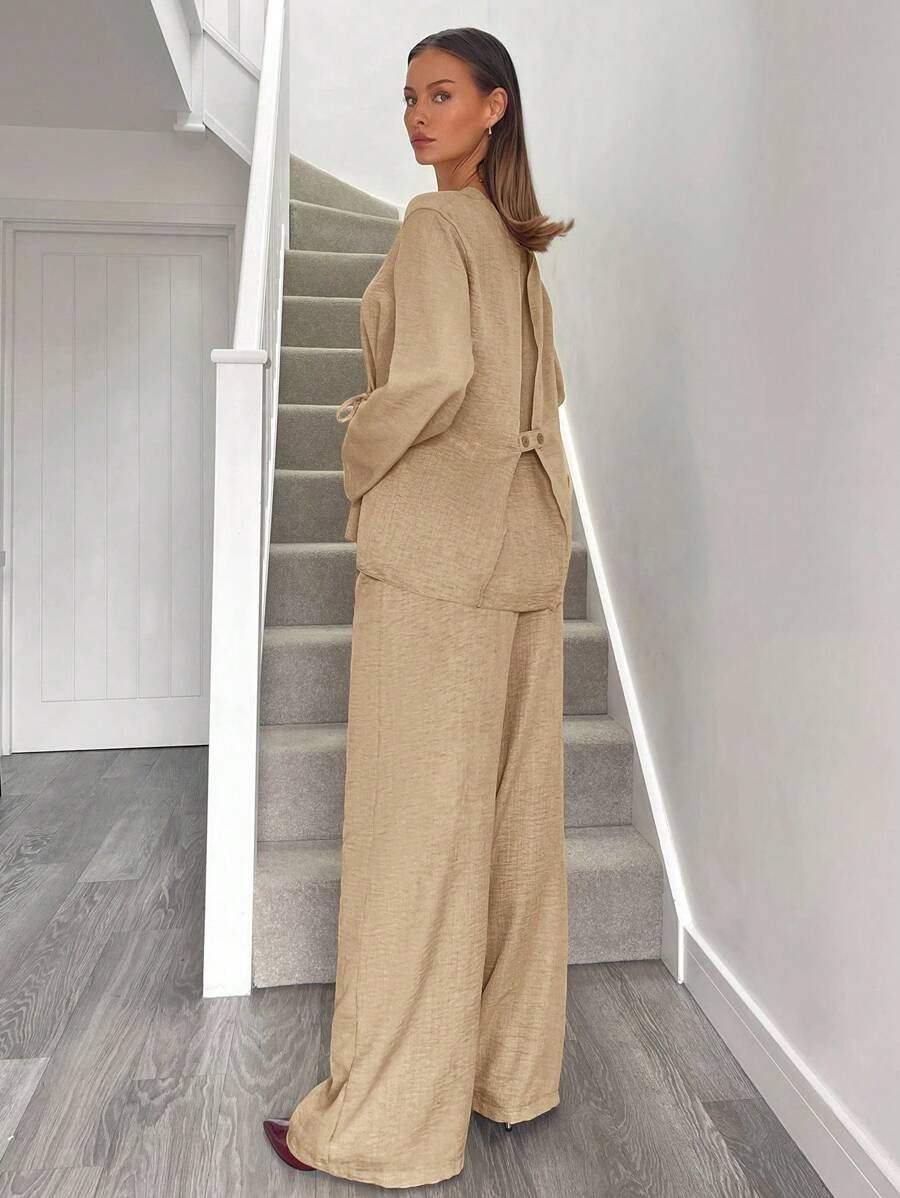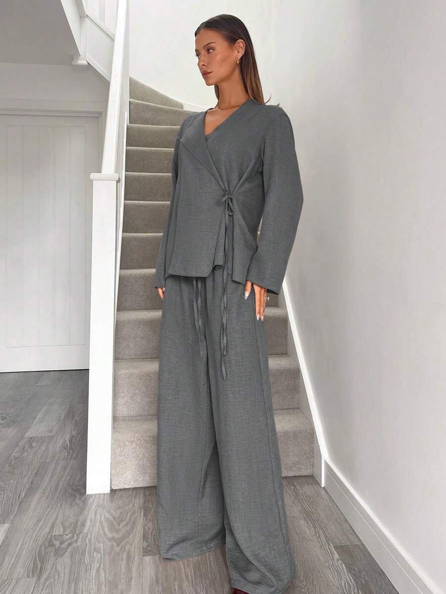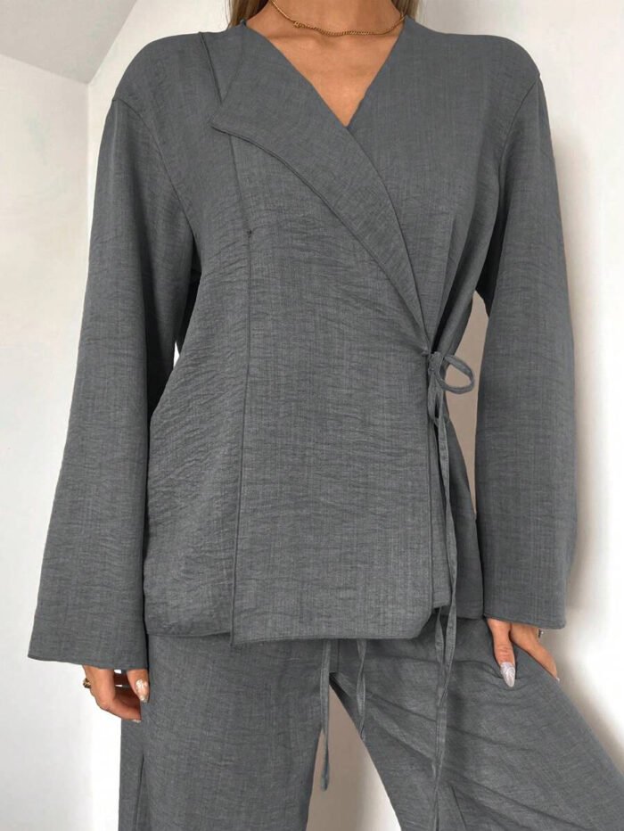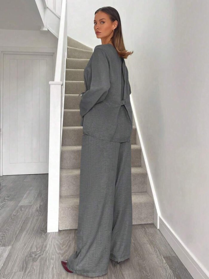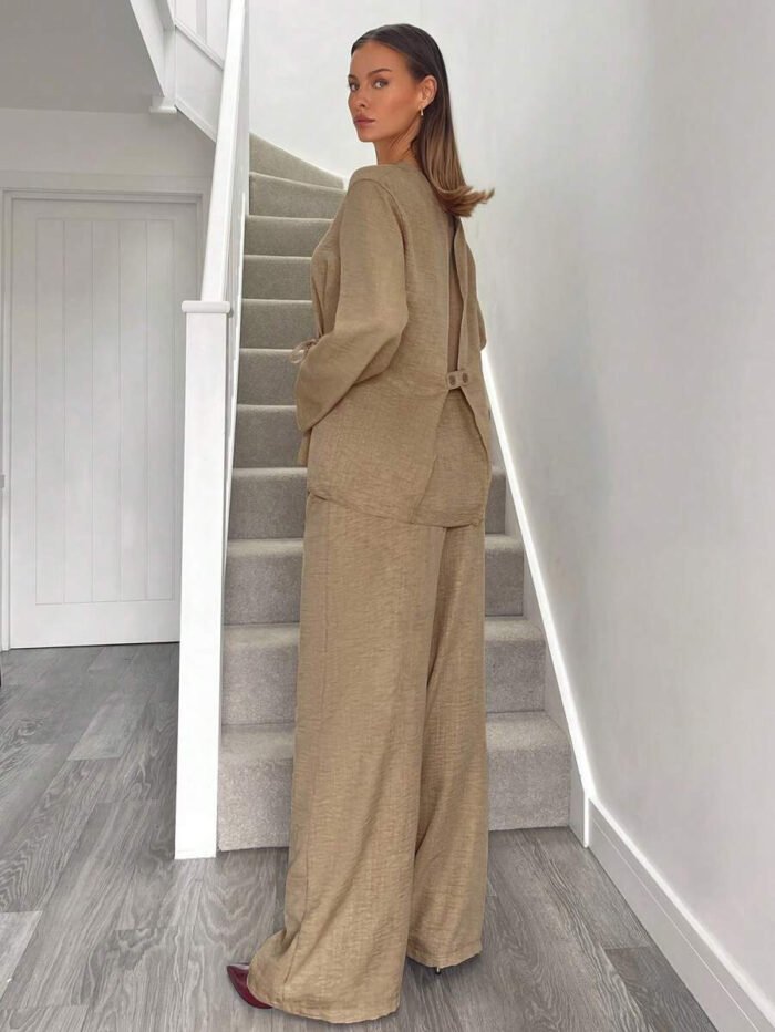 يتكون طقم بدلة نسائية من بلوزة أنيقة ذات ياقة على شكل حرف V، تُبرز جمال رقبتك وتضيف لمسة أنوثة جذابة. يمكنكِ تعديل الرباط الأمامي ليناسب مقاسك تمامًا ويمنحكِ إطلالة فريدة ومُخصصة. أما البنطلون الواسع، فهو مصمم ليوفر لكِ الراحة وحرية الحركة طوال اليوم، مما يخلق توازنًا مثاليًا بين الأناقة والعملية.