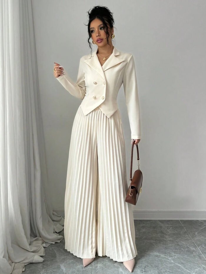 - تصميم البنطلون: بكسرات مع قصة واسعة.