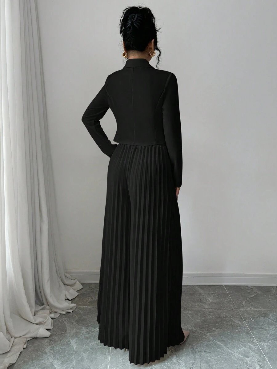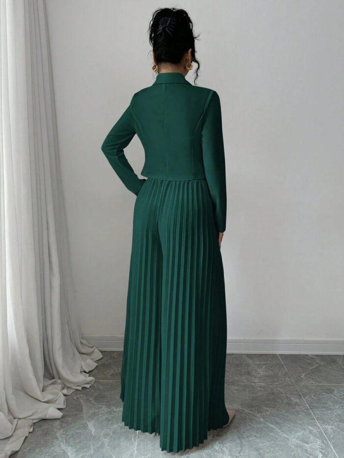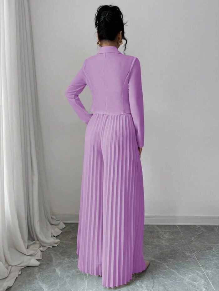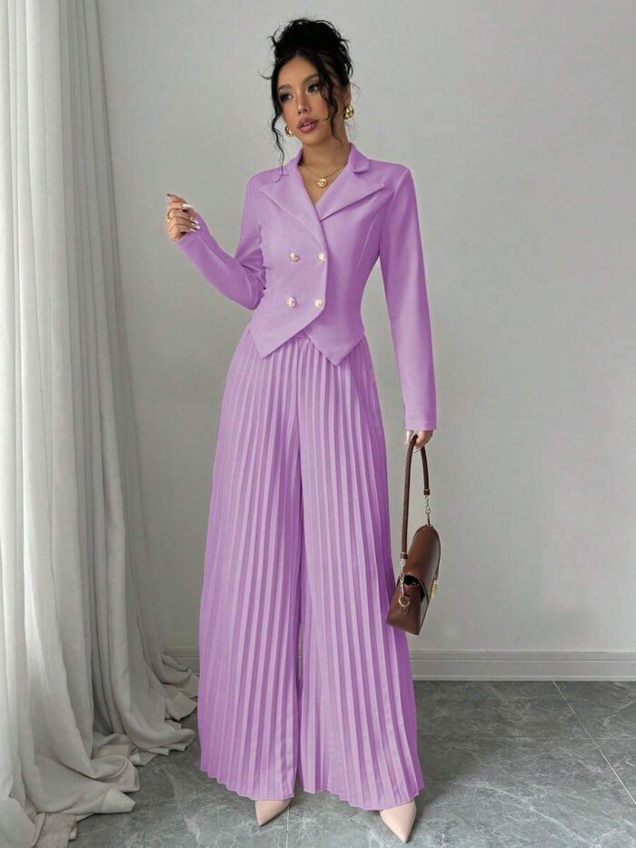 امنحي إطلالتك لمسة من التميز مع طقم سوت نسائي، حيث يجمع هذا التصميم بين الأناقة العصرية والراحة الفائقة ليكون قطعة أساسية لا غنى عنها في خزانة ملابسكِ. يتكوّن الطقم من بلوزة بأكمام طويلة و بنطلون واسع بكسرات، صُمم بعناية ليلائم مختلف المناسبات، سواء في اجتماعات العمل الرسمية أو اللقاءات الاجتماعية غير الرسمية.